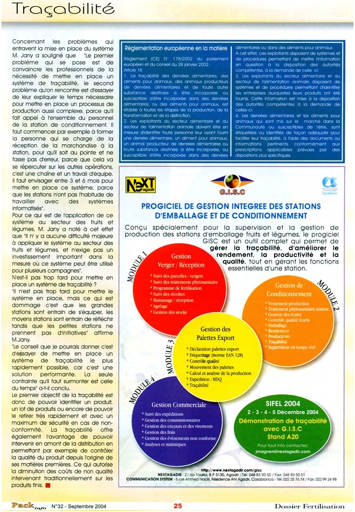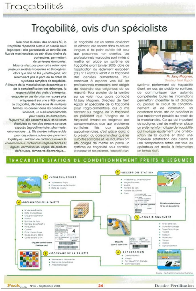 Interview de la revue pack Info concernant la mise en place de solutions de gestion de production et de traçabilité dans la filière fruits et légumes au Maroc par rapport à l'obligation de traçabilité entrant en vigueur le 1 Janvier 2005 pour exporter vers l'U.E.
